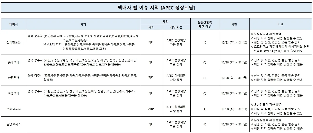 10/29 (수) ~ 10/31 (금) 열리는 APEC 정상회담으로 인한 차량통제로 인한,